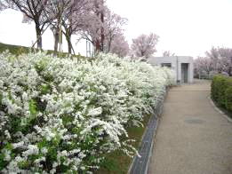 狭い市役所前にかなりの人が並び始めたので、スタート時間を10分早めて9時20分にマップをもらってスタートです。 狭山藩陣屋跡の石碑を見て、狭山池堰堤に登り狭山池博物館に向かいます。 堰堤のは数百本の桜が植えられていて、種類によっては満開を迎え、花見の準備かシートなどで場所取りがしてありました。 また、博物館周辺では雪柳も植えられていて、桜との共演が見事でした。