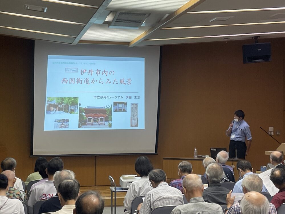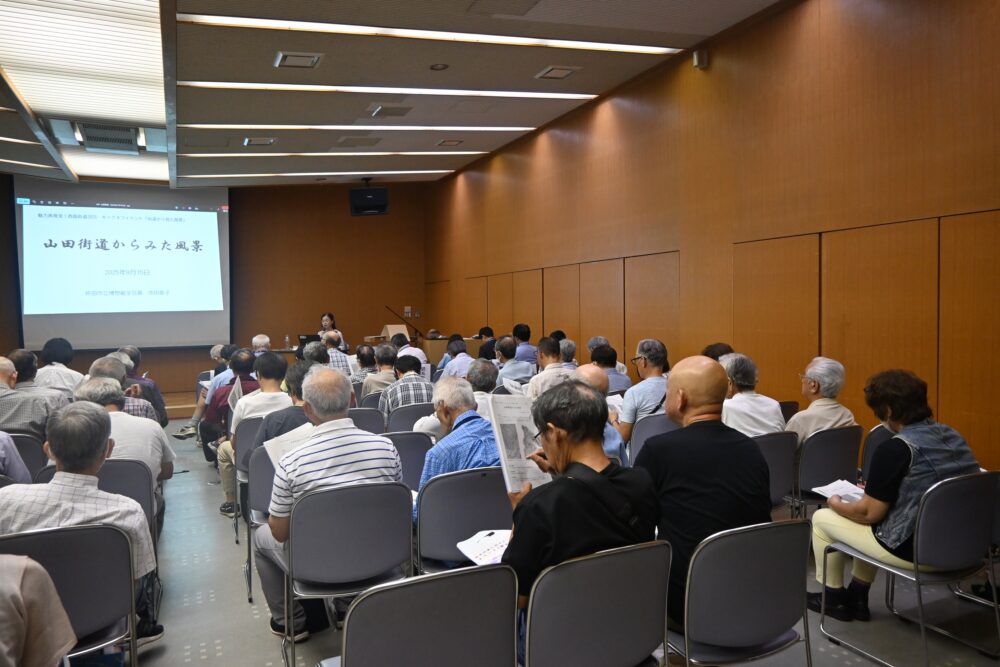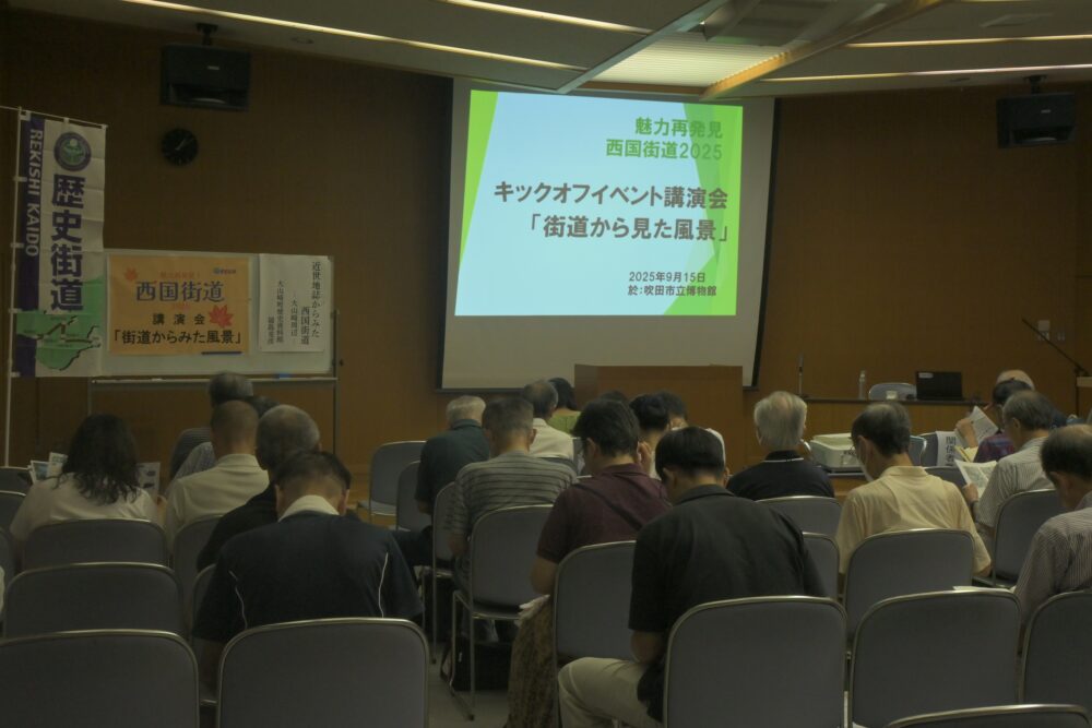 9月15日(月・祝)、吹田市立博物館の講座室において、「魅力再発見 西国街道2025」のキックオフイベントとして講演会「街道からみた風景」を開催しました。 当日は、街道からみた風景をテーマに、西国街道沿道の資料館・博物館の学芸員の方々が、「近世地誌から見た西国街道ー大山崎周辺ー」(大山崎歴史資料館 福島克彦氏)、「いいネ!しまもと ー昔の風景ー」(島本町立歴史文化資料館 久保直子氏)、「西国街道と高槻の風景」(高槻市立しろあと歴史館 眞田拓弥氏)、「山田街道からみた風景と題し、多くの写真や資料を使い、リレー方式で講演していただきました 当日は、93名の方がご参加、メモをとるなど、学芸員の方々のお話を熱心に聴いていただけました。