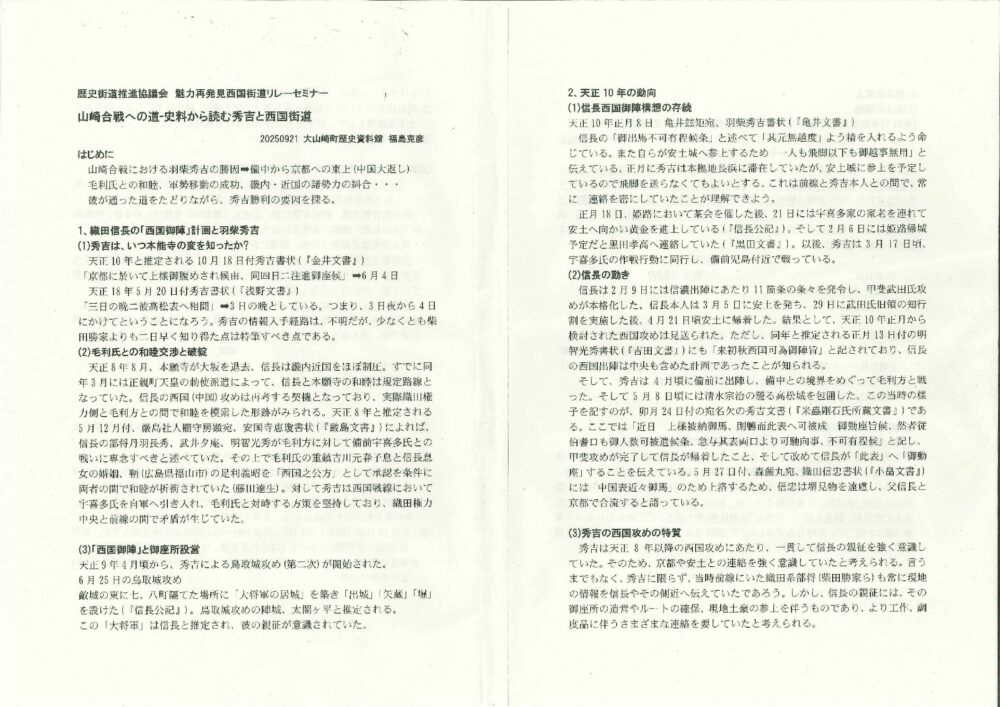 魅力再発見!西国街道2025 西国街道連携事業セミナー 第1回 (大山崎町) 山崎合戦への道 =史料から読む秀吉と西国街道=