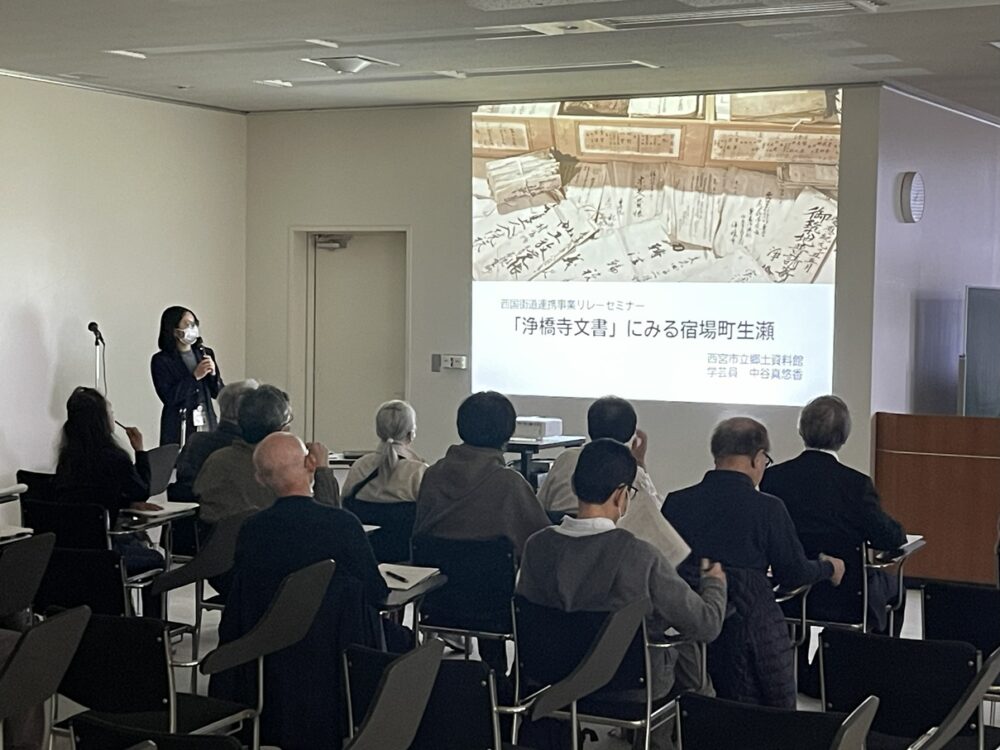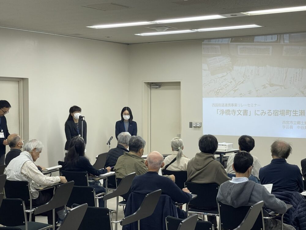 西国街道連携事業リレーセミナー 第3回 「浄橋寺文書」からみる宿場町生瀬 が、西宮市立郷土資料館講座室に於いて開催されました。中谷様より西宮市指定文化財「浄橋寺文書」の解説に始まり、江戸時代の街道・宿駅の役割、生瀬宿の分かりやすく丁寧な解説を聞いてまいりました。セミナー終了後には、中谷様による特別展の解説もあり、参加された皆さまから、質問攻めになっているのが印象的でした。