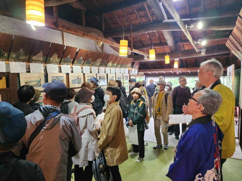 宿場独特の稲妻型屋敷割をうの家の造りを見て説明を受けた後、中山道街道交流館では、守山市指定文化財の「天満宮三十六歌仙絵」や宇野宗祐元総理大臣が寄付したというコレクションを鑑賞。東門院、土橋、一里塚、勝部神社をめぐりました。