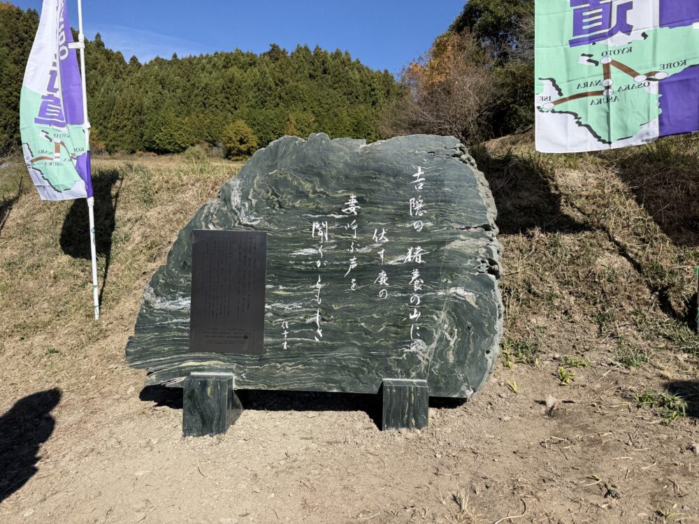 宇陀市と桜井市の境界を過ぎると吉隠(よなばり)に入ります。伊勢本街道の道標を右に信号を渡り急な坂道をのぼっていくと今回、新しくたった万葉歌碑の除幕式が行われました。