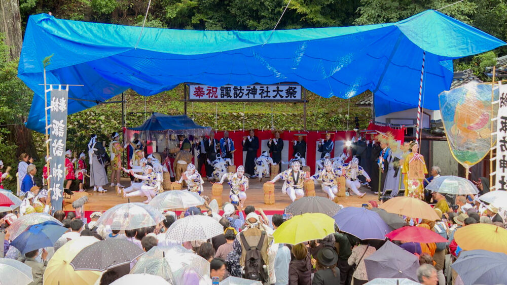 豊作や勇武などの縁起を祝う美山町鶴ヶ岡 諏訪神社の大祭。その奉納芸の華麗さと、5つの村が多額の費用をかけ取り組むことから「棚野の千両祭」(京都府登録無形民俗文化財)と呼ばれています。太鼓や鐘、歌、踊りなどの所作は、親から子、子から孫へと、代々口伝で受け継がれてきました。今回は、コロナ禍を経て20年ぶりに開催される「棚野の千両祭」をご紹介します。