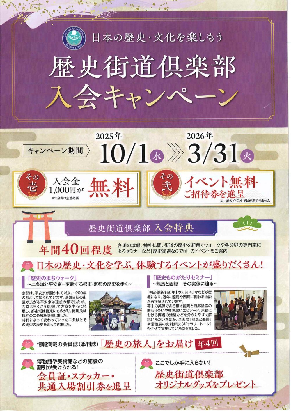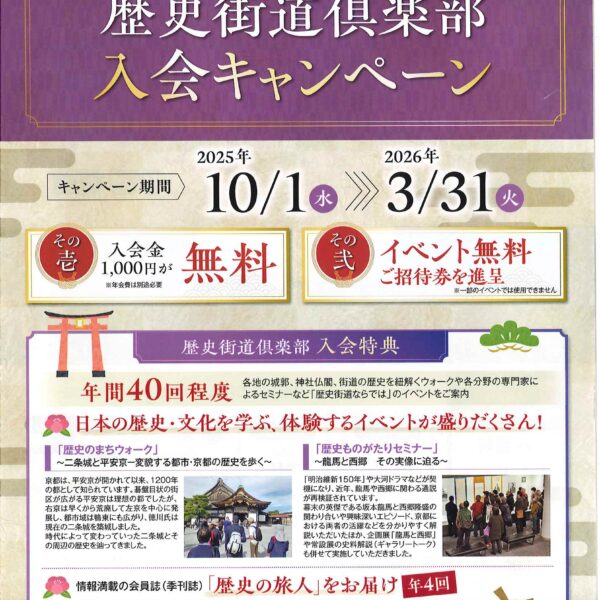 歴史街道倶楽部 お知らせ 歴史街道倶楽部 お知らせ イベント 会員特典 会員誌 入会案内 フォーラム 「歴史街道倶楽部入会キャンペーン」開始しました! 「歴史街道倶楽部入会キャンペーン」を開始しました。 期間中は、入会金(1,000円)が無料でご入会いただけるほか、歴史街道倶楽部のイベントやセミナーで使用できる(一部除く)無料ご招待券が1枚付いてきます。 このお得な機会にぜひご入会ください。 ご入会はこちら 歴史街道倶楽部 お知らせ イベント 会員特典 会員誌 入会案内 フォーラム