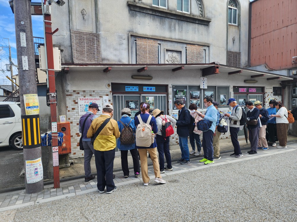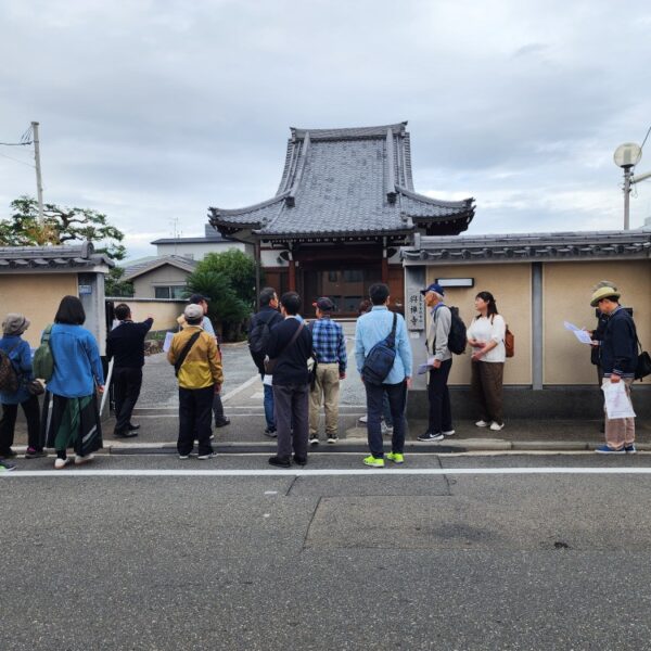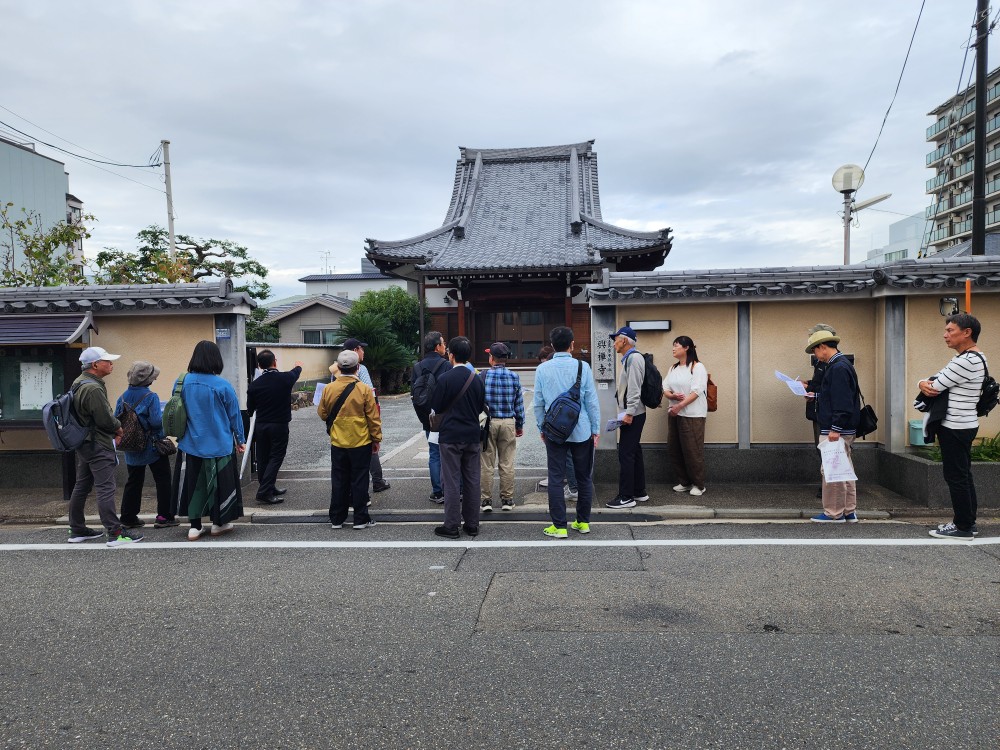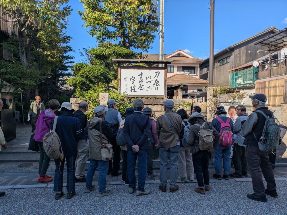 霊山歴史館 学芸課長の木村武仁さんに、寺田屋襲撃事件における龍馬の逃走ルートを再現ということで、伏見酒蔵の風景、龍馬とお龍 愛の旅路像、寺田屋(中庭のみ)、土佐藩伏見屋敷跡碑、西岸寺(油掛地蔵)、西教寺、興教寺、龍馬が隠れた材木小屋跡碑、薩摩藩伏見屋敷跡碑(龍馬が保護された藩邸で、西郷も出入りしていた)、大黒寺(寺田屋騒動殉難志士の墓所、平田靱負の墓)などを解説付きで案内していただきました。