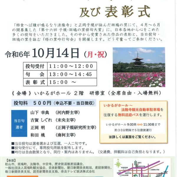 新着情報 イベント情報 お知らせ ニュース メディア イベント情報 フォーラム 展示 西国 親子参加型プログラム 飛鳥奈良京都 フォーラム・展示 第十六回 子規・斑鳩の里俳句大賞「搭の里吟行句会」及び表彰式 4月~6月の間募集した「第十六回 子規・斑鳩の里俳句大賞」に、日本各地から心をこめた多くの投句っをいただきました。その中から受賞された作品の表彰式と当日投句・斑鳩の里を詠む「搭の里吟行句会」を開催です! 詳しくは 概要 開催日 2024年10月14日(月) お知らせ ニュース メディア イベント情報 フォーラム 展示 西国 親子参加型プログラム 飛鳥奈良京都 フォーラム・展示