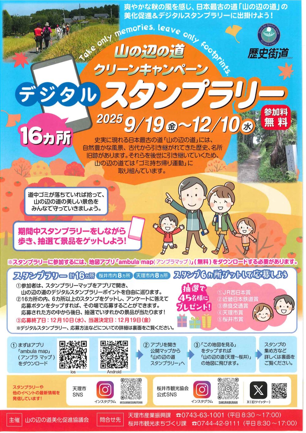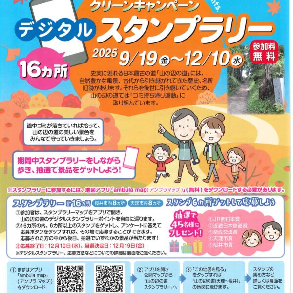 新着情報 イベント情報 お知らせ ニュース メディア イベント情報 フォーラム 展示 西国 親子参加型プログラム 飛鳥奈良京都 フォーラム・展示 山の辺の道クリーンキャンペーン「デジタルスタンプラリー」 古代から引き継がれてきた歴史、名所旧跡を後世に引き継いでいくため、山の辺の道では「ゴミ持ち帰り運動」に取り組んでいます。 爽やかな秋の風を感じ、日本最古の道「山の辺の道」の美化促進&デジタルスタンプラリーに出掛けよう! 詳しくは 概要 開催日 2025年09月19日(金)~2025年12月10日(水) お知らせ ニュース メディア イベント情報 フォーラム 展示 西国 親子参加型プログラム 飛鳥奈良京都 フォーラム・展示