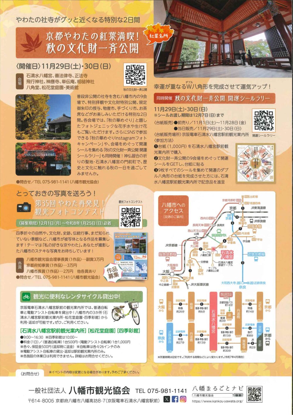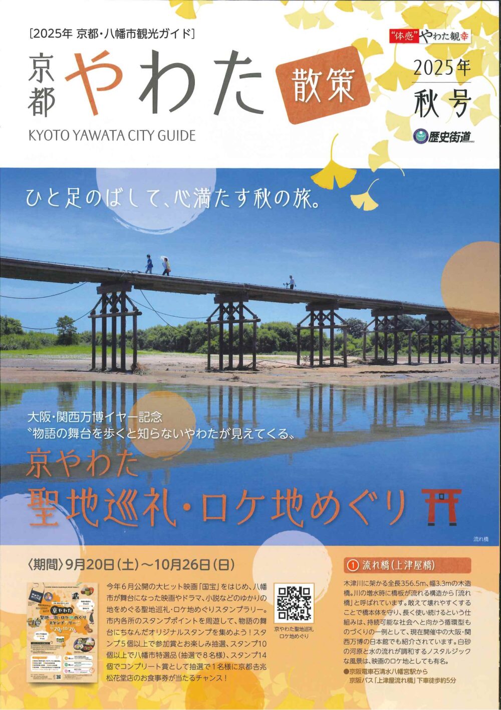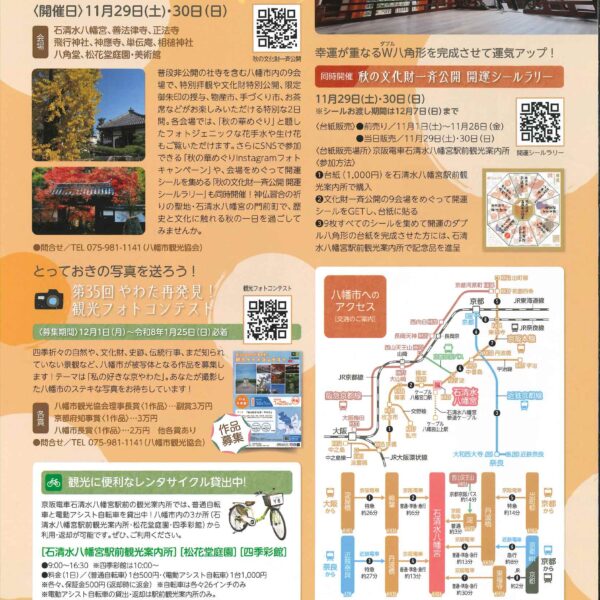 新着情報 イベント情報 お知らせ ニュース メディア イベント情報 フォーラム 展示 西国 親子参加型プログラム 飛鳥奈良京都 フォーラム・展示 京都やわた散策 秋号(秋の文化財一斉公開)発刊 2025年 京都・八幡市観光ガイド「京都やわた散策 秋号」が発刊されました。 「京やわた聖地巡礼・ロケ地めぐり」や「秋の文化財一斉公開」など秋の八幡市の様々な観光情報が掲載されています。 詳しくは 概要 開催日 2025年09月20日(土)~2025年11月30日(日) お知らせ ニュース メディア イベント情報 フォーラム 展示 西国 親子参加型プログラム 飛鳥奈良京都 フォーラム・展示