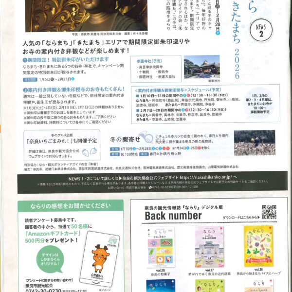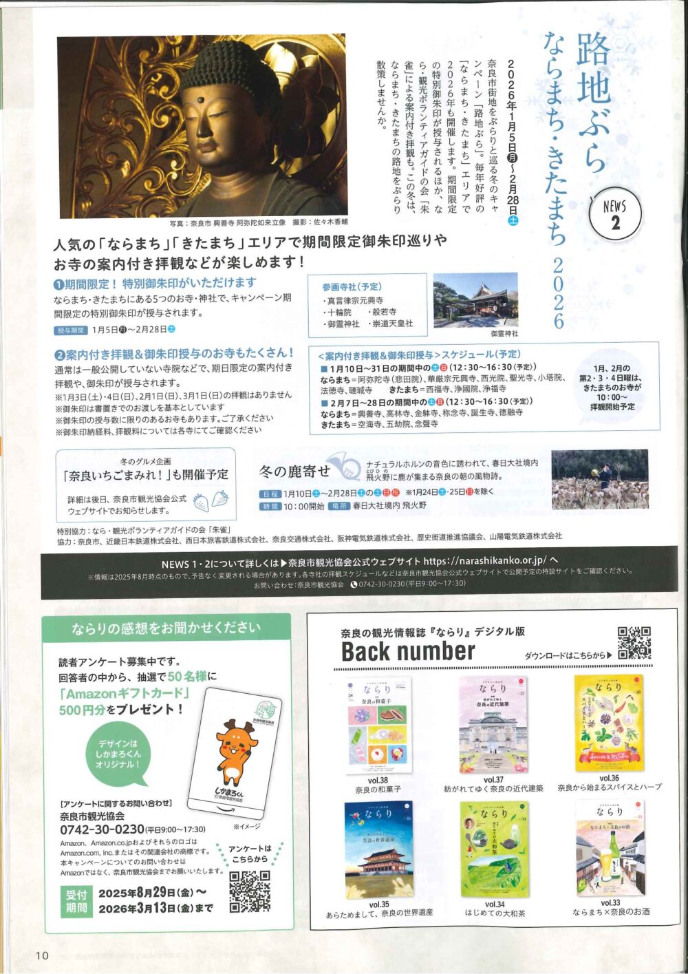 新着情報 イベント情報 お知らせ ニュース メディア イベント情報 フォーラム 展示 西国 親子参加型プログラム 飛鳥奈良京都 フォーラム・展示 「路地ぶら ならまち・きたまち」 奈良市街地をぶらりと巡る冬のキャンペーン「路地ぶら」。 街歩きで人気の「ならまち」「きたまち」エリアで、期間限定御朱印巡りや お寺の案内付き拝観、 いちごスイーツ巡りを お楽しみください。 詳しくは 概要 開催日 2026年01月05日(月)~2026年02月28日(土) お知らせ ニュース メディア イベント情報 フォーラム 展示 西国 親子参加型プログラム 飛鳥奈良京都 フォーラム・展示