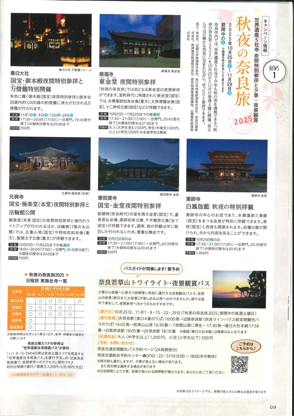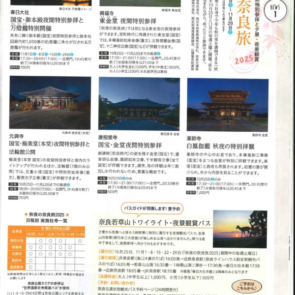 新着情報 イベント情報 お知らせ ニュース メディア イベント情報 フォーラム 展示 西国 親子参加型プログラム 飛鳥奈良京都 フォーラム・展示 秋夜の奈良旅2025 世界遺産5社寺で秋の夜間特別参拝と夕景・夜景観賞! 夜間特別参拝では、夜ならではの厳かな空気に包まれながら、ゆったりと参拝できます。 詳しくは 概要 開催日 2025年10月25日(土)~2025年11月29日(土) お知らせ ニュース メディア イベント情報 フォーラム 展示 西国 親子参加型プログラム 飛鳥奈良京都 フォーラム・展示
