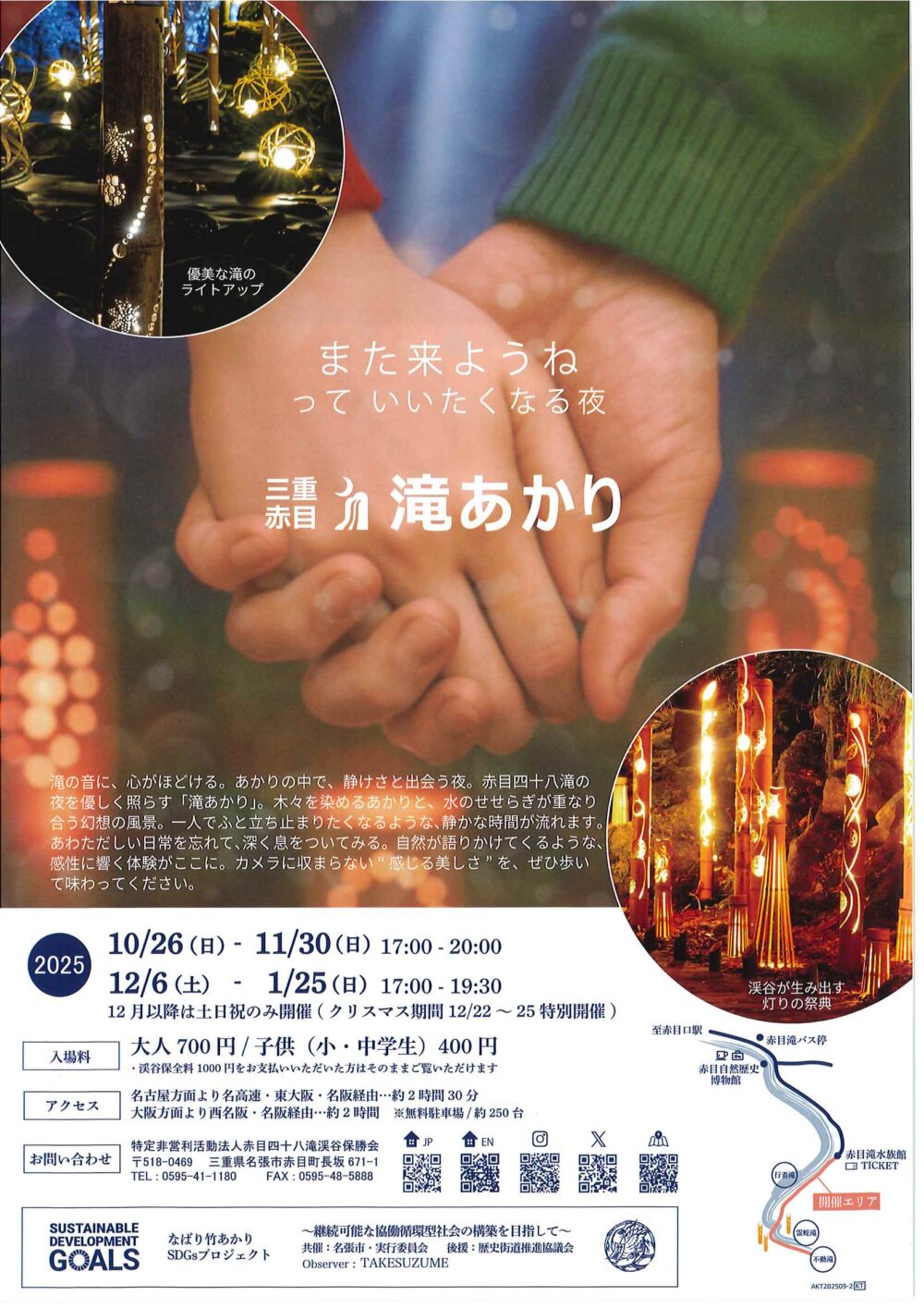 新着情報 イベント情報 お知らせ ニュース メディア イベント情報 フォーラム 展示 西国 親子参加型プログラム 飛鳥奈良京都 フォーラム・展示 三重赤目「滝あかり」 滝の音に、心がほどける。 あかりの中で、静けさと出会う夜。赤目四十八滝の夜を照らす「滝あかり」。自然が語りかけてくるような、感性に響く体験がここに。カメラに収まらない感じる美しさを、味わってください。 詳しくは 概要 開催日 2025年10月26日(日)~2025年11月30日(日) 2025年12月06日(土)~2026年01月25日(日) お知らせ ニュース メディア イベント情報 フォーラム 展示 西国 親子参加型プログラム 飛鳥奈良京都 フォーラム・展示