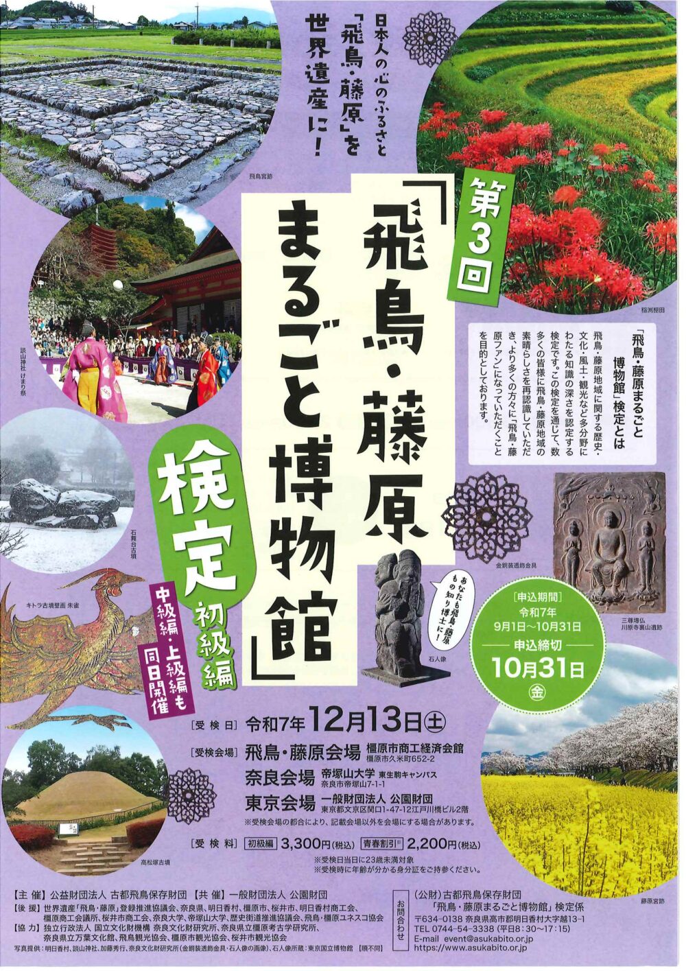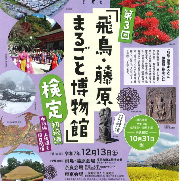 新着情報 イベント情報 お知らせ ニュース メディア イベント情報 フォーラム 展示 西国 親子参加型プログラム 飛鳥奈良京都 フォーラム・展示 「飛鳥・藤原まるごと博物館」検定 飛鳥・藤原地域に関する歴史・文化・風土・観光など多分野にわたる知識の深さを認定する検定です。 より多くの方々に「飛鳥・藤原ファン」になっていただきたく、開催します! お申込は、10月31日(金)までです。 ご参加お待ちしております。 詳しくは 概要 開催日 2025年12月13日(土) お知らせ ニュース メディア イベント情報 フォーラム 展示 西国 親子参加型プログラム 飛鳥奈良京都 フォーラム・展示