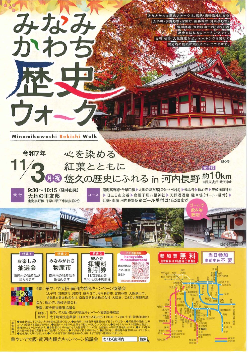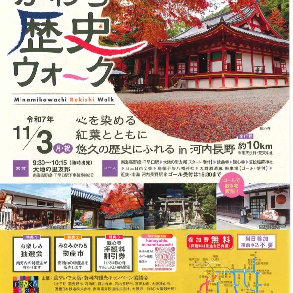 新着情報 イベント情報 お知らせ ニュース メディア イベント情報 フォーラム 展示 西国 親子参加型プログラム 飛鳥奈良京都 フォーラム・展示 みなみかわち歴史ウォーク みなみかわち歴史ウォークは、近鉄・南海沿線にある、太子町・羽曳野市・河南町・藤井寺市・河内長野市・富田林市・大阪狭山市の5市2町の歴史を訪ねるウォーキングです。 古墳・社寺・文化遺産などウォーキングを通して南河内の歴史に触れることができます。 詳しくは 概要 開催日 2025年11月03日(月) お知らせ ニュース メディア イベント情報 フォーラム 展示 西国 親子参加型プログラム 飛鳥奈良京都 フォーラム・展示
