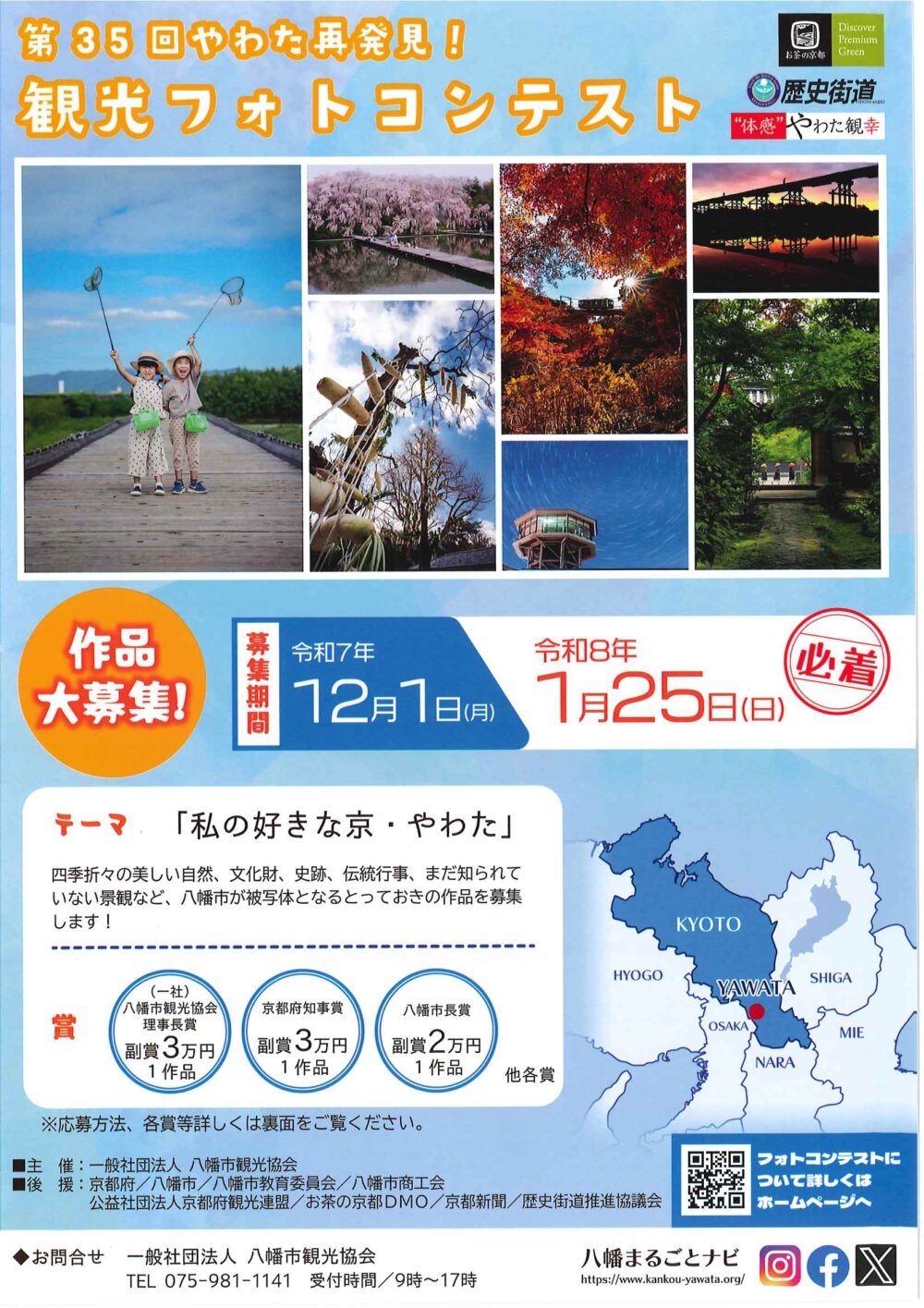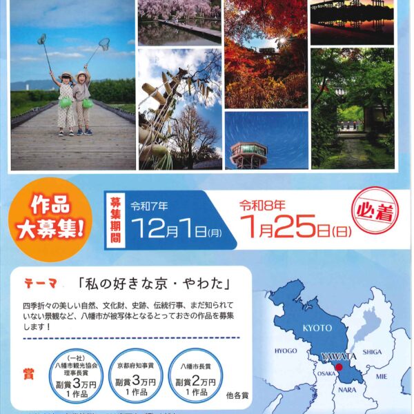 新着情報 イベント情報 お知らせ ニュース メディア イベント情報 フォーラム 展示 西国 親子参加型プログラム 飛鳥奈良京都 フォーラム・展示 第35回やわた再発見!観光フォトコンテスト 八幡市観光協会では、「第35回 やわた再発見!観光フォトコンテスト」の応募作品を募集します! テーマは「記憶に残る京・やわた」。 あなたの目に留まった四季折々の美しい自然や文化財、史跡、伝統行事、まだ知られていない景観など、八幡市が被写体となるとっておきの作品をお待ちしております。 詳しくは 概要 開催日 2025年12月01日(月)~2026年01月25日(日) お知らせ ニュース メディア イベント情報 フォーラム 展示 西国 親子参加型プログラム 飛鳥奈良京都 フォーラム・展示