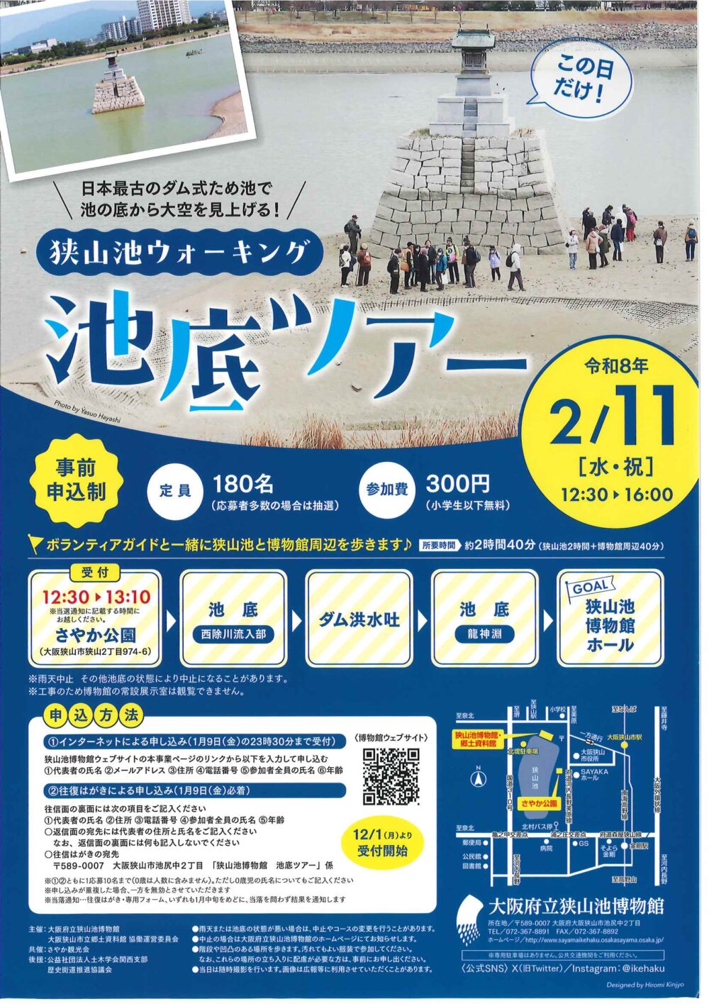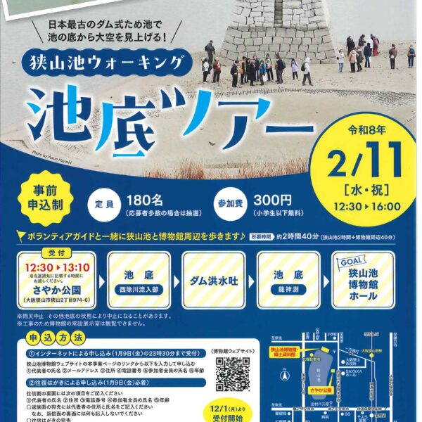 新着情報 イベント情報 お知らせ ニュース メディア イベント情報 フォーラム 展示 西国 親子参加型プログラム 飛鳥奈良京都 フォーラム・展示 令和8年狭山池ウォーキング「池底ツアー」 日本最古のダム式ため池で池の底から大空を見上げる! ボランティアガイドと一緒に狭山池の池底と博物館周辺を歩きます。 行程約3kmのウォーキングイベントです。 ※12月1日(月)から受付開始中~ 詳しくは 概要 開催日 2026年02月11日(水) お知らせ ニュース メディア イベント情報 フォーラム 展示 西国 親子参加型プログラム 飛鳥奈良京都 フォーラム・展示