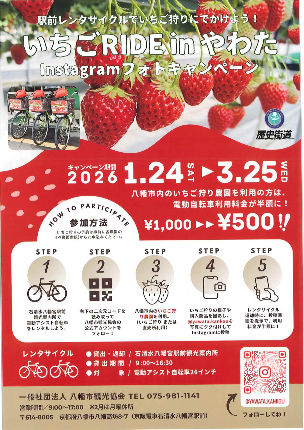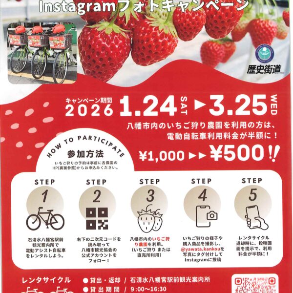 新着情報 イベント情報 お知らせ ニュース メディア イベント情報 フォーラム 展示 西国 親子参加型プログラム 飛鳥奈良京都 フォーラム・展示 いちご RIDE in やわた 2026 Instagram フォトキャンペーン 駅前レンタサイクルで市内のいちご狩り農園や直売所を利用された方を対象に「いちごRIDE in やわた2026 Instagramフォトキャンペーン」を開催します! ぜひこの機会にお得な駅前レンタサイクルを利用して、やわたのいちご狩りを楽しみましょう♪ 詳しくは 概要 開催日 2026年01月24日(土)~2026年03月25日(水) お知らせ ニュース メディア イベント情報 フォーラム 展示 西国 親子参加型プログラム 飛鳥奈良京都 フォーラム・展示