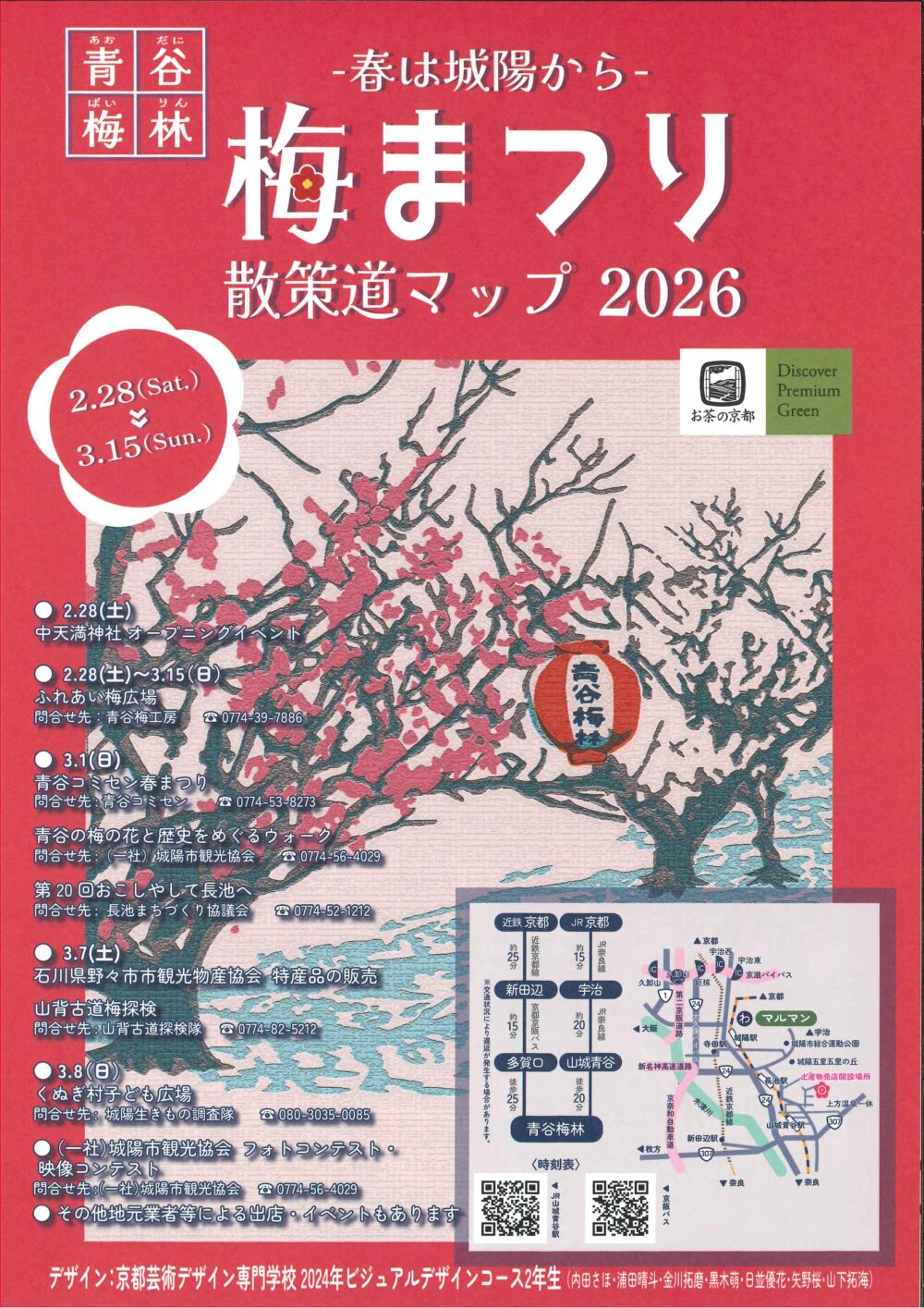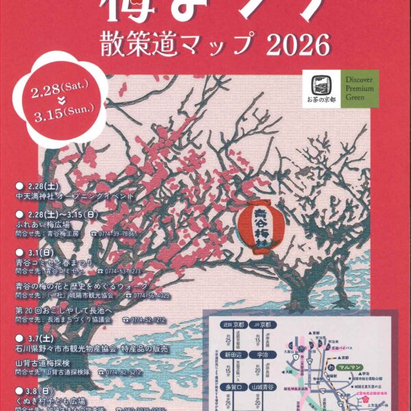新着情報 イベント情報 お知らせ ニュース メディア イベント情報 フォーラム 展示 西国 親子参加型プログラム 飛鳥奈良京都 フォーラム・展示 ~春は城陽から~青谷梅林梅まつり 今年も梅まつりを開催します! 今年は中天満神社で梅を使った特産品などの土産物の販売を行います。 この機会にぜひ、梅まつり散策道マップを片手に梅林散策をしてみませんか 詳しくは 概要 開催日 2026年02月28日(土)~2026年02月15日(日) お知らせ ニュース メディア イベント情報 フォーラム 展示 西国 親子参加型プログラム 飛鳥奈良京都 フォーラム・展示