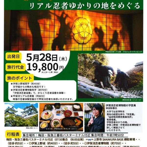 梅田・阪急三番街バスターミナル付近(07:50集合 08:00出発)====上野市 SAKAKURA BASE 横駐車場・・・(約5分)・・・◎伊賀上野城(約40分)・・・(約5分)・・・◎伊賀流忍者博物館(約70分)・・・(約5分)・・・☆伊賀百貨(お買物)・上野市 SAKAKURA BASE 横駐車場====★もりつぢ (昼食 約60分)====◎甲賀流リアル忍者館(約60分)====梅田・付近(16:30頃着)
