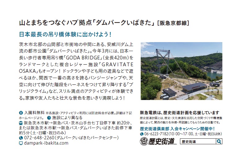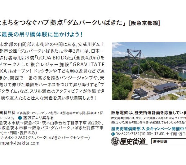 新着情報 メディア お知らせ ニュース メディア イベント情報 フォーラム 展示 西国 親子参加型プログラム 飛鳥奈良京都 フォーラム・展示 阪急電車沿線情報紙「TOKK」11月号掲載記事のご案内 毎月1日発行。歴史街道推進協議会は、「TOKKイチオシEvent&News」のコーナーに連載中。 11月号では、安威川ダムの上流に整備され、令和5年度末に完成した都市公園「ダムパークいばきた」、また令和7年3月には、ダム湖などの壮大な景色を楽しめる、日本一長い歩行者専用吊り橋「GODA BRIDGE」をランドマークとした複合レジャー施設「GRAVITATE OSAKA」について紹介しています。 お知らせ ニュース メディア イベント情報 フォーラム 展示 西国 親子参加型プログラム 飛鳥奈良京都 フォーラム・展示