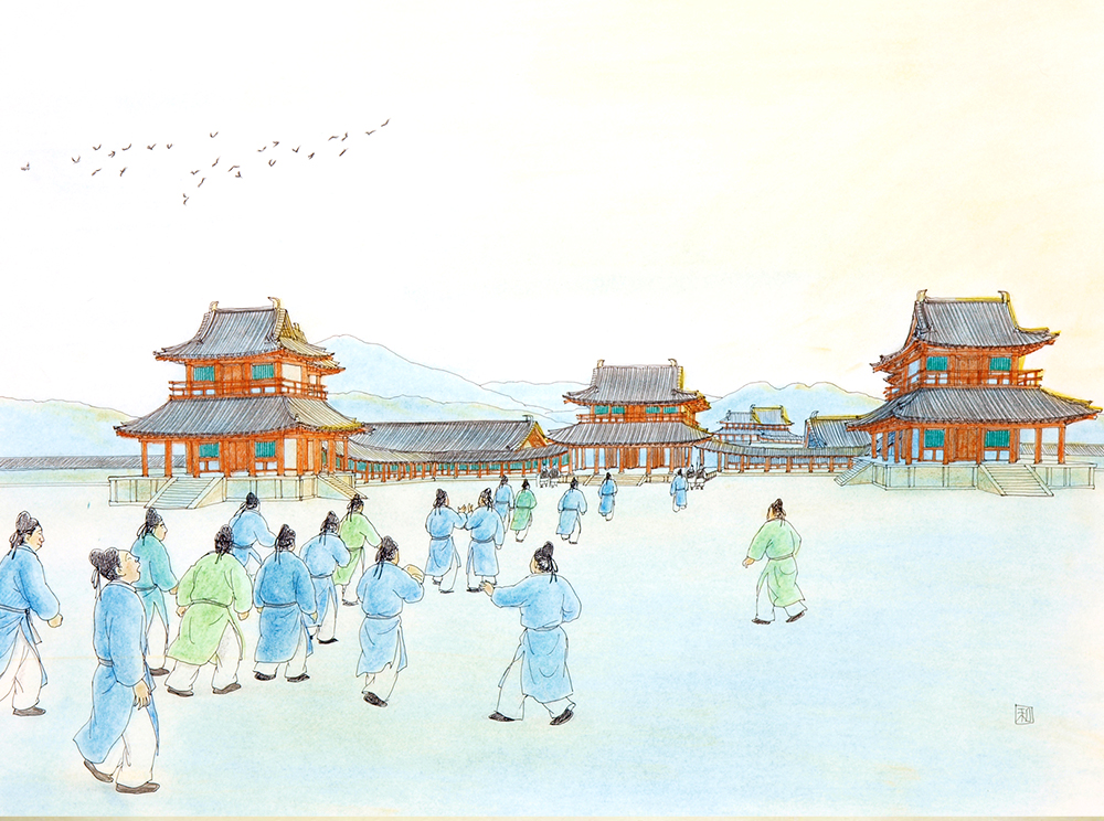 大極殿は、政務や儀式の際に天皇が臨御(りんぎょ)する建物です。北側に控えの間の後殿があり、四方を廊下付きの塀(回廊:かいろう)で囲われていた。石敷きの前庭には元旦朝賀に7基の宝幢(ほうどう)が立てられました。閤門(こうもん)とよばれる正門があり、その南に太政官院(だじょうかんいん)(朝堂院)の区画があります。東西に4堂ずつ、計8堂の朝堂が置かれ、中央に広場(朝庭:ちょうてい)がありました。太政官や八省の官人、親王らが政務や儀式に臨席する場です。朝堂院南門から左右に続く回廊は途中で南に折れ曲がり、その先端に平安宮の「翔鸞楼(しょうらんろう)」に相当する楼閣(ろうかく)建物が付属したことが、平成17年(2005)に発見されました。このような楼閣が付く門は長岡宮で初めて出現するもので、桓武天皇が中国の都城を理想としたことの表れといえます。