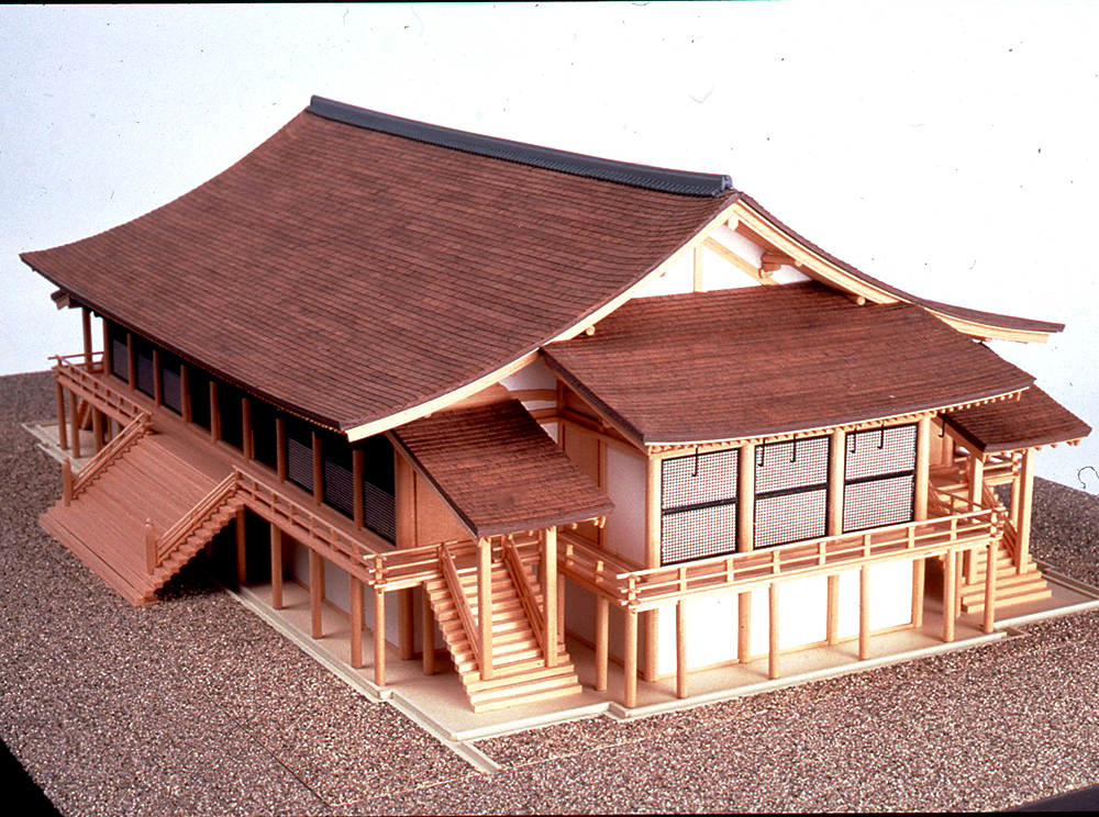 内裏は、天皇と皇后、それに仕える女官たちの住まいである。土塀の両側に廊下を付けた築地回廊(ついじかいろう)で囲まれた内郭と、これを一回り大きく囲んだ外郭があります。内郭中央やや南寄りの正殿は、梁間3間、桁行9間、床面積約242坪という長岡京最大の建物で、平安宮の紫宸殿(ししんでん)に相当します。その他の殿舎配置も平安宮の内裏にほぼ一致することがわかりました。外郭は瓦葺きの土塀で囲われ、石敷きや導水施設が設けられていました。